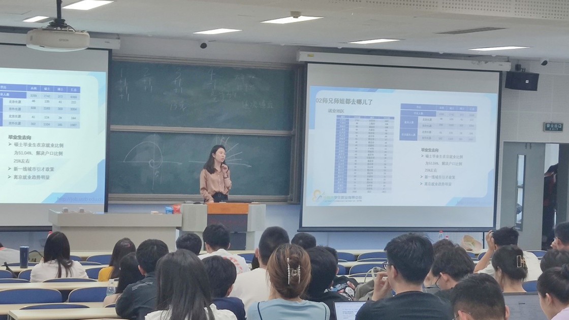 研究生的就业优势,并对不同的就业选择进行了详细的讲解,逐步引导大家如何做好决策。之后,她通过学校以及学院近两年就业数据的对比,为同学们解读了毕业生的就业选择和毕业去向。