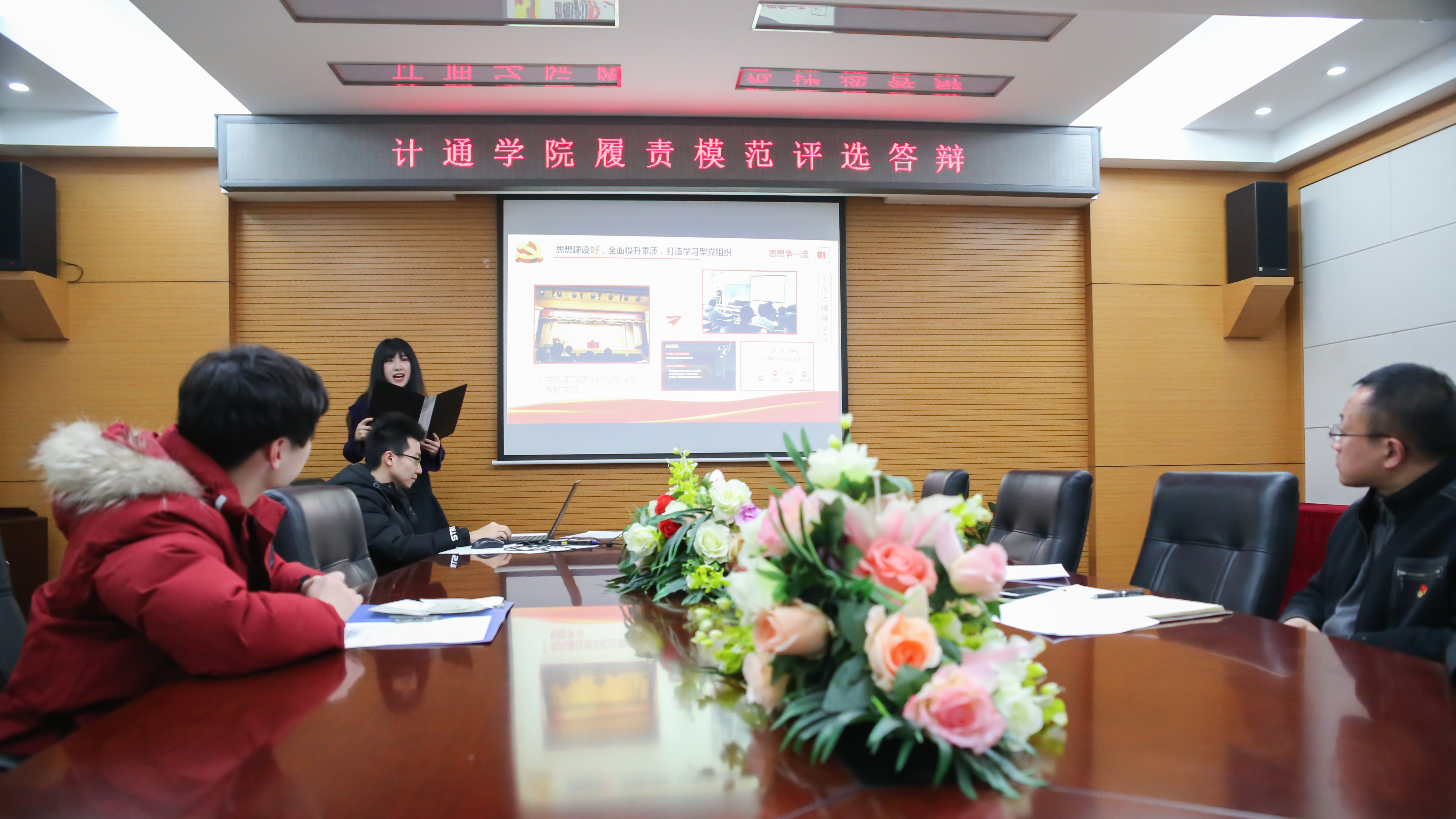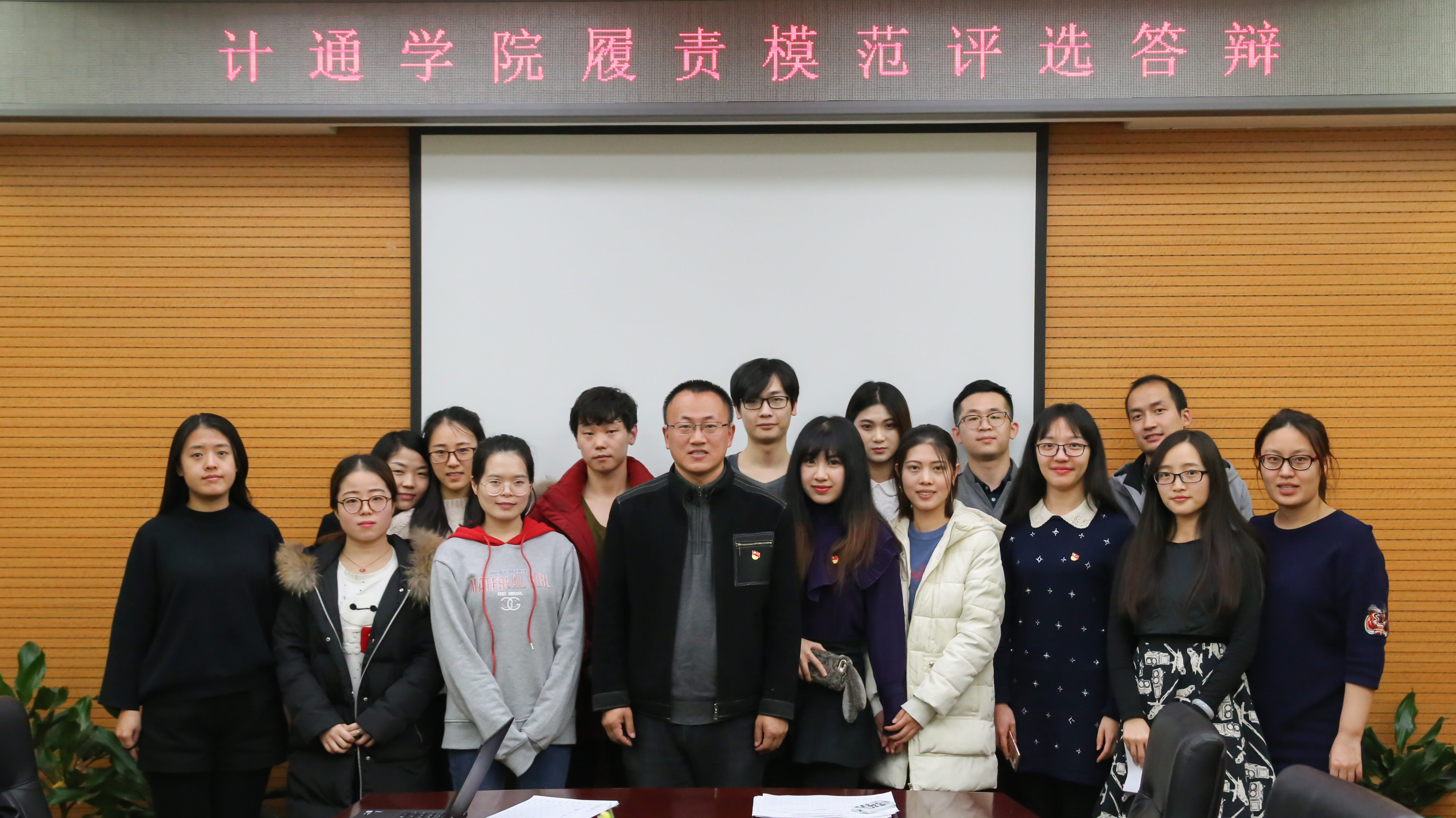 2018年1月5日晚, 2017年度计通学院“履责模范”评选答辩在机电楼601举行,计通学院党委副书记杨健以及各年级辅导员出席本次答辩会,会议由团委副书记、本15级兼硕16级辅导员李毅萍主持。