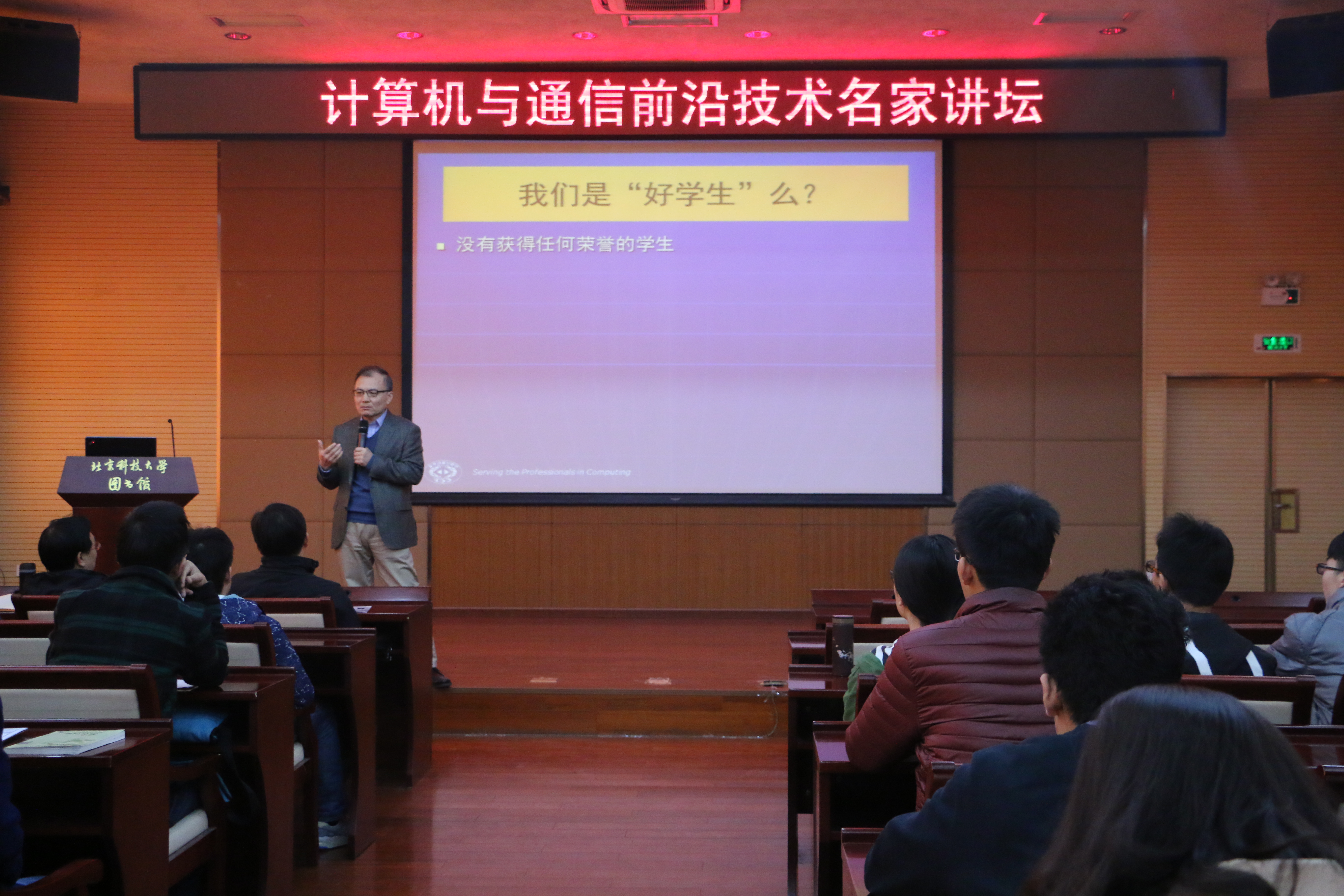 接下来,杜子德讲了毕业之后的工作经历,他由一个计算机技术达人逐步走向一个全面发展、“万金油”式的优秀人才。在NGO从业20年,改变了CCF的发展进程,促进了计算机行业的蓬勃发展。之后,他又开始提供一些职业规划方面的指导,让大家明确了自己毕业后的去向。他最后总结道,大学教育的目标不仅仅是学习知识,而是全面提高学生的能力、激发潜能。同学们要从现在规划未来,才能创造辉煌成就。