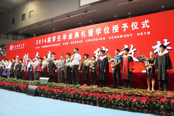 6月20日上午,“点赞青春 绽放梦想”北京科技大学2014届毕业典礼在体育馆隆重举行,全校3000余名夏季毕业的本科生、研究生和留学生齐聚一堂,迎来了学成毕业的难忘时刻,共同接受全校师生对自己的美好祝福,感受激动人心的毕业氛围,度过自己人生旅途中的重要节点。院长隆克平、党委书记黄武南、副院长苏栋、第十五届“我爱我师——我心目中最优秀的老师”学院获奖教师张爽、石志国、皇甫伟,首届“研师亦友——我最喜爱的导师”获奖导师郑雪峰和学院300余名应届毕业生参加典礼。