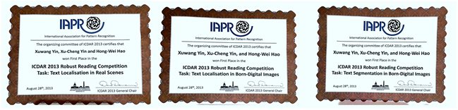 在2013年国际文档分析与识别大会技术竞赛上,我们的创新技术获得本届大赛最受关注的Robust Reading Competition竞赛“自然场景文本检测”、“网络图片文本检测”、和“网络图片文本提取”三项冠军。其中,“网络图片文本提取”和“网络图片文本检测”获胜结果性能比第二名分别提高了19.36%和8.37%。
