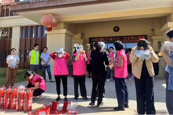 参训人员逐一进行消防器材实操演练,确保人人掌握、人人会用;应急疏散演练模拟儿童生活区突发火情,现场施放烟雾,真实还原火灾场景,演练流程衔接紧密、处置得当。