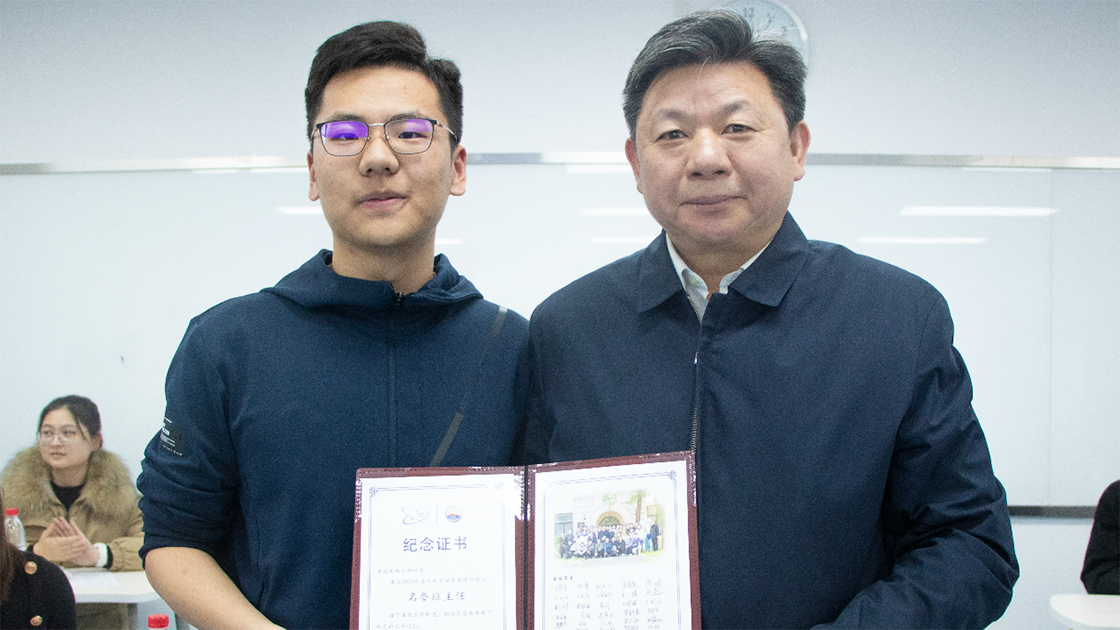 班长于笑洋代表全体同学向杨校长赠送“名誉班主任”的纪念证书