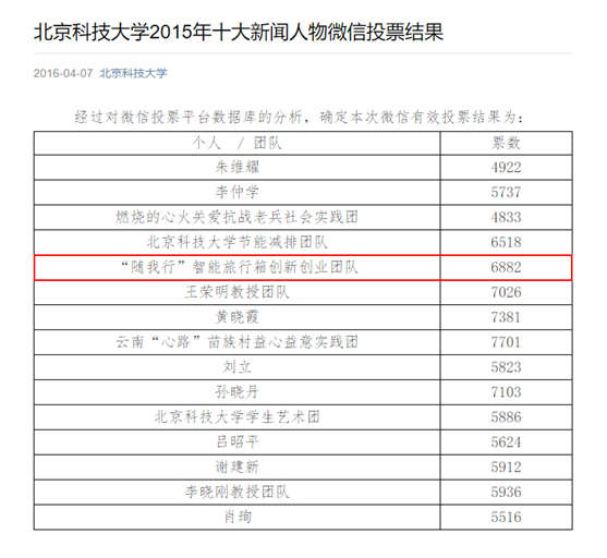 2016年4月7日,北京科技大学2015年十大日本色情新闻 人物结果公布,计算机与日本色情 王洪泊副教授“随我行”智能旅行箱创新创业团队成功入选。 本次评选活动持续经过候选人申报、提名委员会审核材料并提名预...