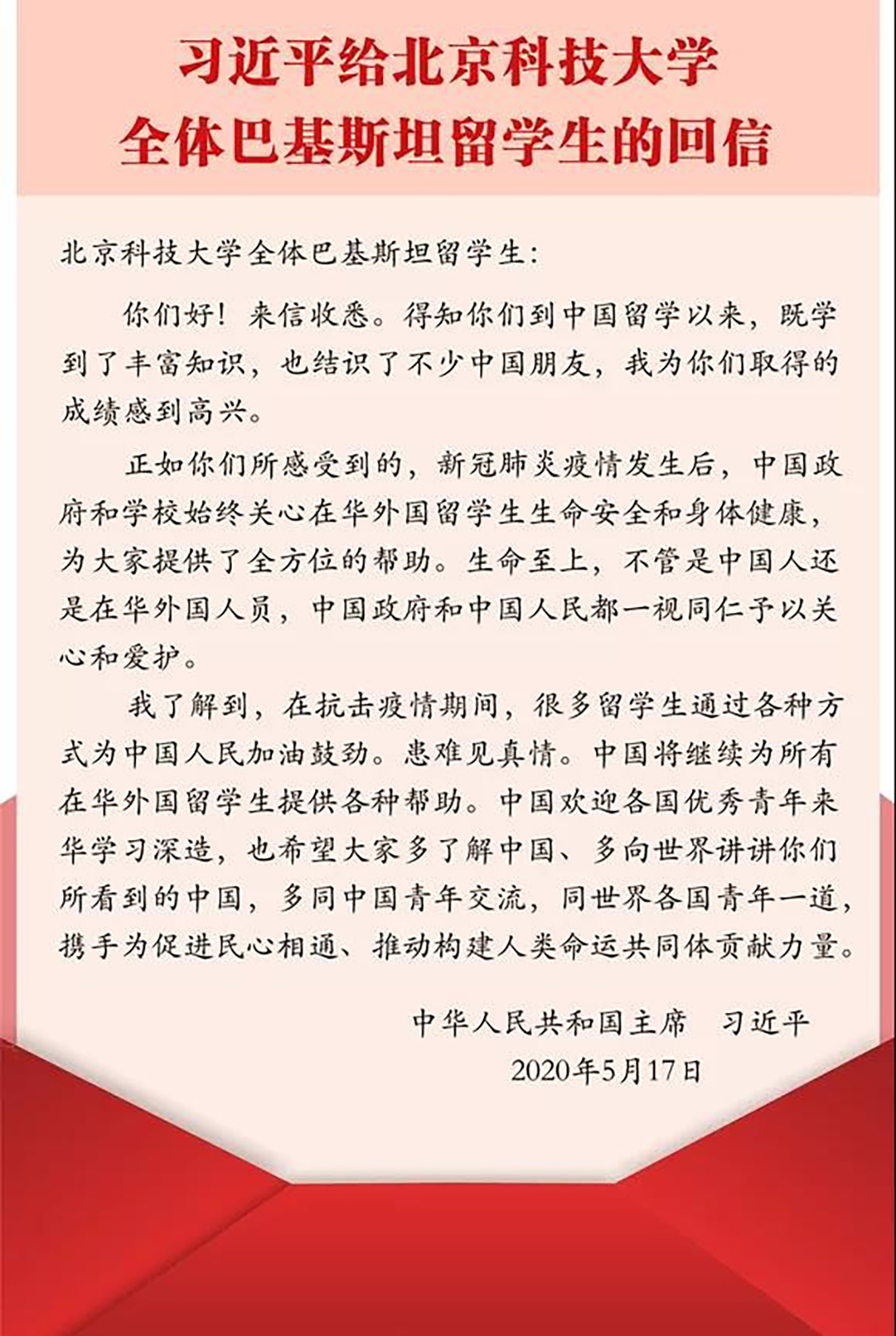 5月18日,新华社受权全文发布《习近平给北京科技大学全体巴基斯坦留学生的回信》。为学习贯彻习近平总书记重要回信精神,18日晚,北京科技大学举办“以重要回信精神为指引,开创学校事业发展新局面——北京科技大学师...